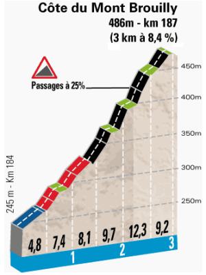 - Côte du Mont Brouilly, 2ª (km 187): 486 m – 3 km – 8,4 %