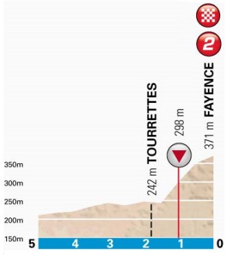 Una vez coronado restarán 19 km para la línea de meta, con un largo e irregular descenso, complicado debido a su estrechez y escasa visibilidad (aunque la carretera está en perfectas condiciones y salvo en el primer tramo no hay muchas curvas cerradas) de vuelta a Tourretes y la parte baja de Fayence, donde los corredores tendrán que afrontar de nuevo el muro subido antes del primer paso por meta. La cifra oficial es de 1,5 km al 8,6% de media, pero debido a su irregularidad, con rampones y descansillos, puede hacerse más dura de lo que indica ese dato, teniendo 1,2 km iniciales al 10%, con puntas que rondan el 20%, antes de 2 curvas seguidas de 180º y un final más tendido, siendo una llegada propicia para los escaladores explosivos y «up-hill finishers».