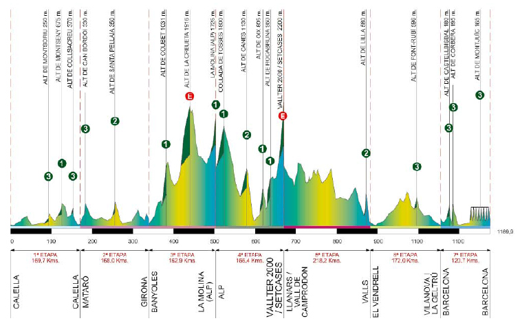 Así pues, la carrera se inicia en Calella con una etapa circular de media montaña, aunque con puertos de escasa dureza, seguida por una jornada básicamente llana (aunque el exagerado perfil puede hacer creer lo contrario) con final en Girona. En la 3ª etapa llega la alta montaña, con un final en la estación de esquí de La Molina (hasta el km 7) previo paso por Santigosa y el Coll de la Creueta, aunque con muchos km de rodeo llano entre este último y la tendida subida final. Al dia siguiente le toca el turno a la jornada reina, con los puertos de Tosses, Canes, Oix-Bucs y Boixeda antes de la dura ascensión a Vallter 2000, que con 12 km finales al 7,5% puede hacer mucho daño a poco que el ritmo sea elevado.