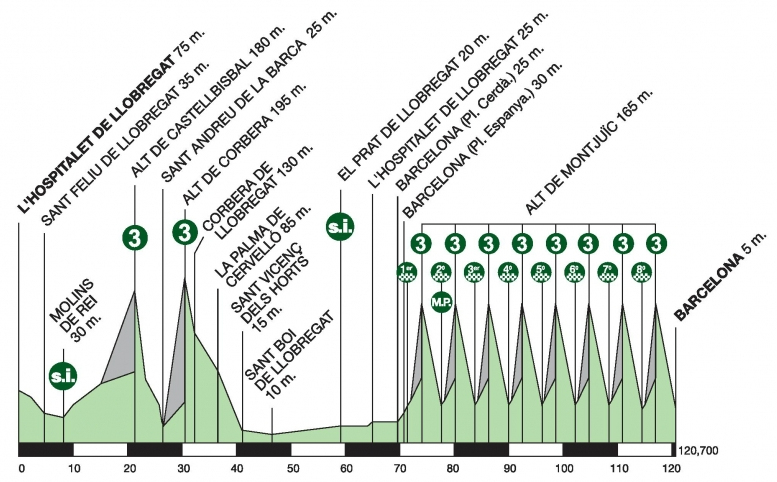 A partir de ahí, descenso hacia Sant Vicenc dels Horts, dando paso a un largo tramo llano de vuelta a Barcelona, con una travesía por el Prat de Llobregat, sprint intermedio incluído, antes de entrar en la ciudad por la Gran Via de L´Hospitalet y seguir por la Gran Via de las Cortes Catalanas hasta la Plaza de España, desde donde se accederá al circuito final a través de la Av. Reina María Cristina, con un primer paso por meta en la Av. de Rius i Taulet.