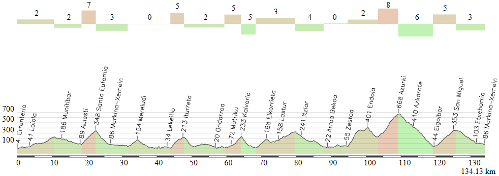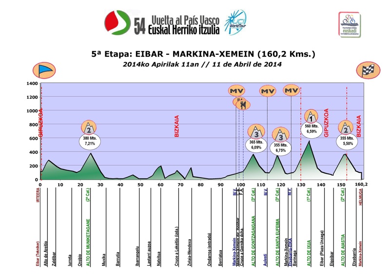 5ª ETAPA (Viernes 11 Abril):  EIBAR – MARKINA-XEMEIN  (160,2 km).  Rutómetro y mapa interactivo