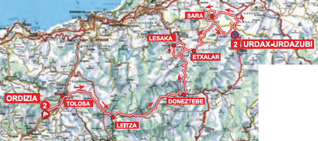 2ª ETAPA (Martes 8 Abril):  ORDIZIA – DANTXARINEA (URDAX-URDAZUBI)  (155,8 km).  Rutómetro y mapa interactivo