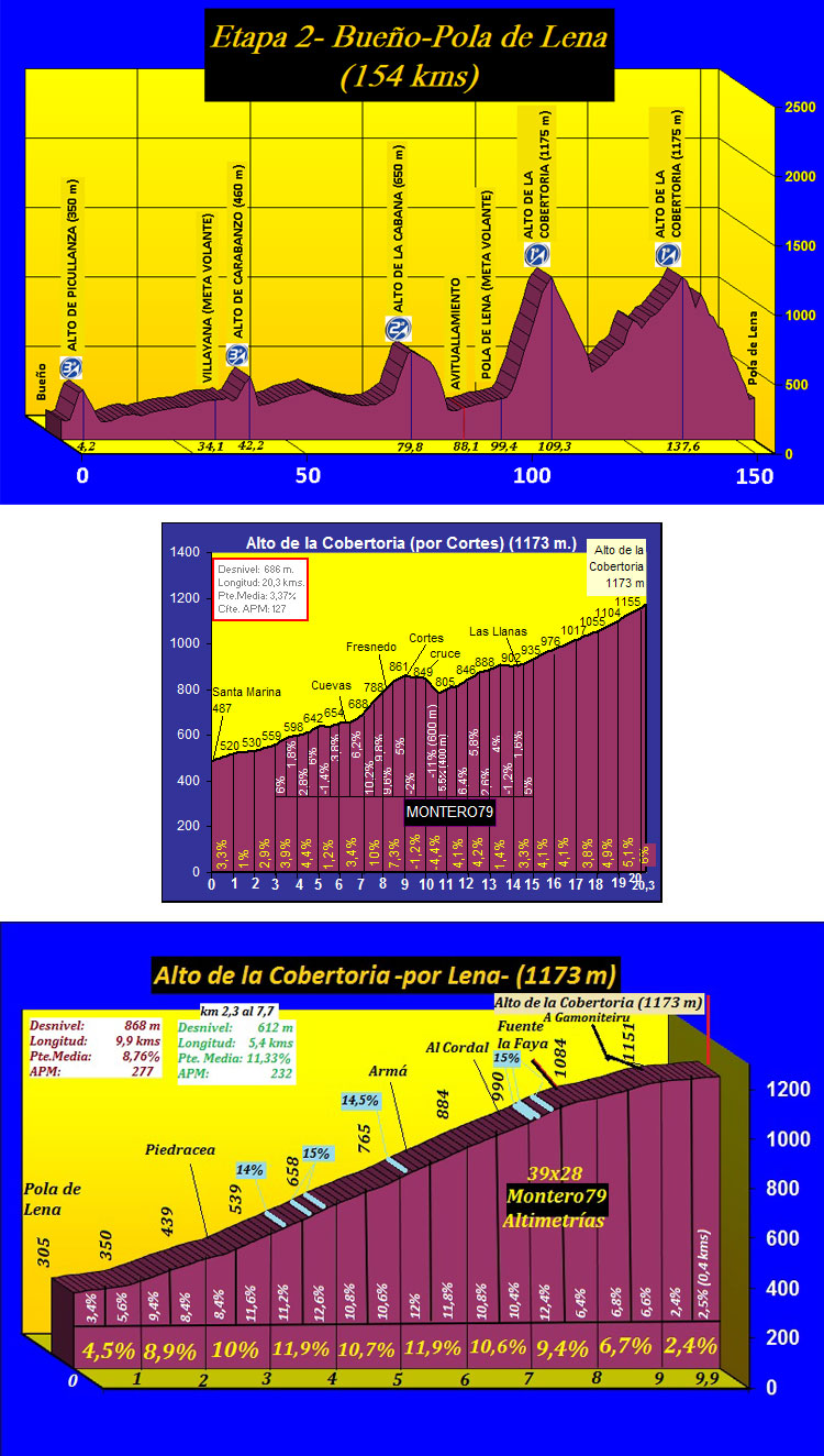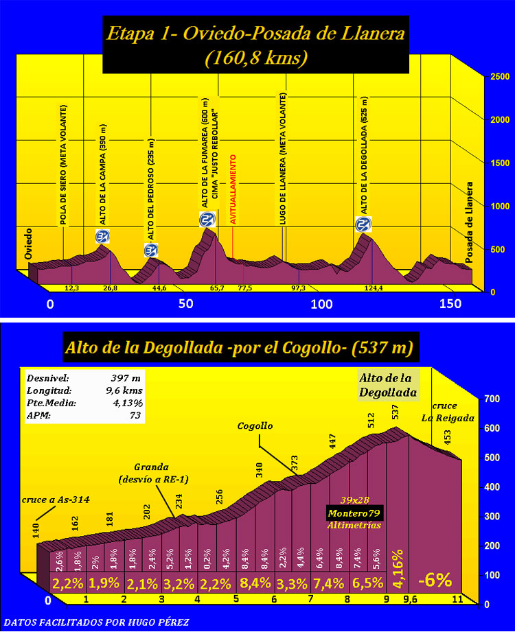 Además, el recorrido programado, diseñado con la colaboración de Marce Montero, 39×28 Altimetrías, era a priori muy interesante, con alicientes en todas las jornadas y destacando la 2ª etapa, con Picullanza de salida y el Alto de la Cabana precediendo a un doble paso por La Cobertoria: el 1º por Pola de Lena, todo un Especial de paso, y el 2º por la vertiente de Cortes, en general tendida pero con un km y medio central al 10%, para una vez superado afrontar un complicado descenso por la carretera del Cuchu Puercu y el Cordal hasta alcanzar la llegada en Pola de Lena.