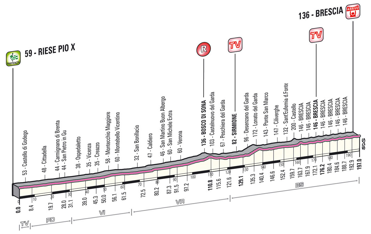 17ª ETAPA (Miércoles 28 Mayo): SARNONICO – VITTORIO VENETO (208 km). Rutómetro web – archivo / Últimos km
