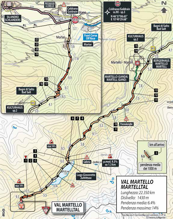 Una vez en la cima del Stelvio restarán casi 70 km para la línea de meta, con un espectacular descenso por su vertiente más famosa y mítica, que incluye hasta 48 “tornantis”, siendo una bajada extremadamente técnica. La última vez que se utilizó como subida (23 km al 7,8% de media) fue en la etapa de 2005 con final en Livigno, coronando Jose Rujano aunque la victoria fue para Ivan Parra. También se subió en la famosa jornada de Aprica 1994, aunque muy lejos de meta. En esta ocasión, acabado el descenso en la localidad de Prato allo Stelvio, habrá casi 15 km más o menos llanos, con sprint intermedio en Lasa, antes de una suave bajada hacia Silandro, seguida por otros 4 km favorables hasta llegar a Coldrano.