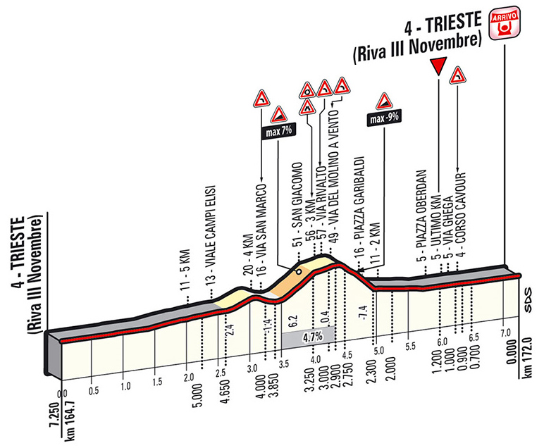 21 ª ETAPA (Domingo 1 Junio): GEMONA DEL FRIULI – TRIESTE (172 km). Rutómetro web – archivo / Últimos km