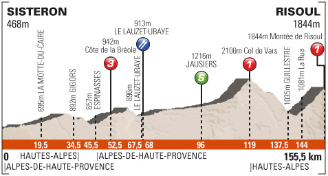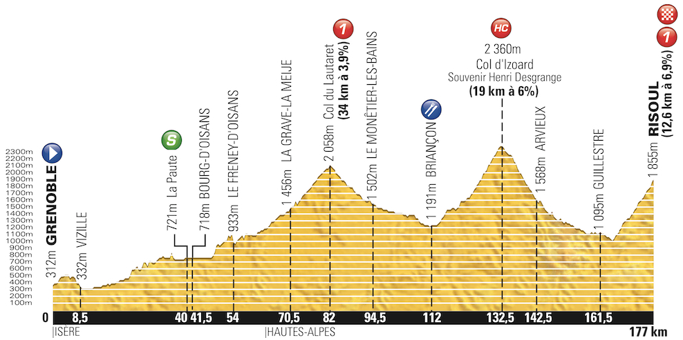 La jornada siguiente es a priori la reina de los Alpes, con salida desde Grenoble y los puertos del Col du Lautaret, muy largo aunque en general tendido; el Col d´Izoard -> perfil oficial, que si bien no se subirá por su vertiente más famosa cuenta con 19 km al 6% de media (los últimos 7 al 8%); y tras su descenso y el paso por Guillestre la ascensión final a Risoul, sin tramos rompedores pero tampoco descansillos, con unas cifras de 12,6 km al 6,9%. No obstante, pese a que la etapa acumula unos 4000 m de desnivel, la ausencia de rampas duras y los falsos llanos entre los puertos, donde puede haber reagrupamientos, hacen que el resultado dependa muchísimo de la actitud de los corredores. Indicar que si bien Risoul se estrena en el Tour, ya ha sido meta en Dauphine: en una jornada unipuerto en 2010, con triunfo para Vogondy; y en una etapa con Vars en 2013, más blanda que la del Tour pero con mejor encadenado, consiguiendo la victoria De Marchi y con Froome sentenciando la general -> clasificación / video.
