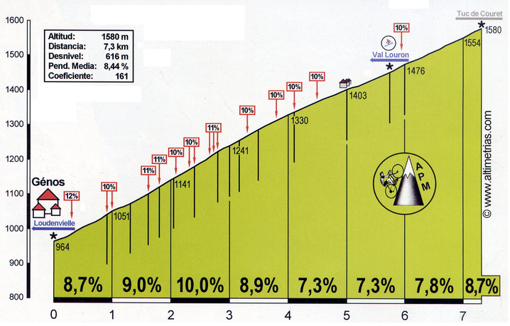 La jornada siguiente en cambio es mucho más corta, con apenas 125 km, pero incluye más puertos y mejor encadenados, con 75 km finales muy duros en los que los corredores tendrán que superar el Portillón, que se sube por la vertiente española; el clásico Peyresourde, sin grandes rampas pero con 11 km finales al 7,4% de media; Val Louron-Azet, reciente llegada en la Ruta del Sur (acabando en la estación); con 4 km iniciales a más del 9%; y tras su descenso y el paso por St.Lary Soulan la subida a Pla d´Adet -> perfil oficial, con unos primeros km que rondan el 10% para unas cifras totales de 10,2 km al 8,3% de media. Una jornada a priori frenética, con un encadenado que siempre ha funcionado muy bien, con los antecedentes de 2001 -> perfil / clasificación, y 2005 -> perfil / clasificación / vídeos, aunque también hay que decir que eran etapas globalmente más duras, ya que rondaban los 200 km e incluían Aspet y Mente antes del Portillón. En cualquier caso, si los ciclistas se muestran combativos se verá un gran espectáculo.