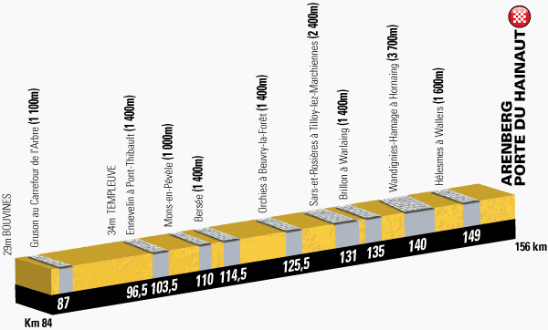 La 3ª jornada, con meta en Londres, es a priori mucho más sencilla, siendo favorable para los sprinters. No obstante, al igual que en las etapas previas existe un fuerte peligro de caídas, sobre todo si llueve. Al final de la jornada se abandonará el Reino Unido, con un traslado en avión hasta el norte de Francia para afrontar una etapa llana entre la localidad costera de Touquet Paris Plage y la ciudad de Lille, siendo de nuevo una jornada propicia para los velocistas. En la 5ª jornada llega una de las etapas más esperadas de esta edición, con salida desde Bélgica y 15,4 km de pavé antes de la meta en Arenberg / Porte du Hainaut, recorriendo 9 tramos de la París-Roubaix (aunque en sentido contrario, con varios de ellos «capados») y pudiendo provocar una auténtica escabechina, con más de un favorito perdiendo sus opciones en la general, sobre todo si se ven involucrados en caídas, como ya sucedió en 2010 -> clasificación / vídeo, con Frank Schleck teniendo que abandonar. En cualquier caso, un día clave para el desarrollo posterior de la prueba.