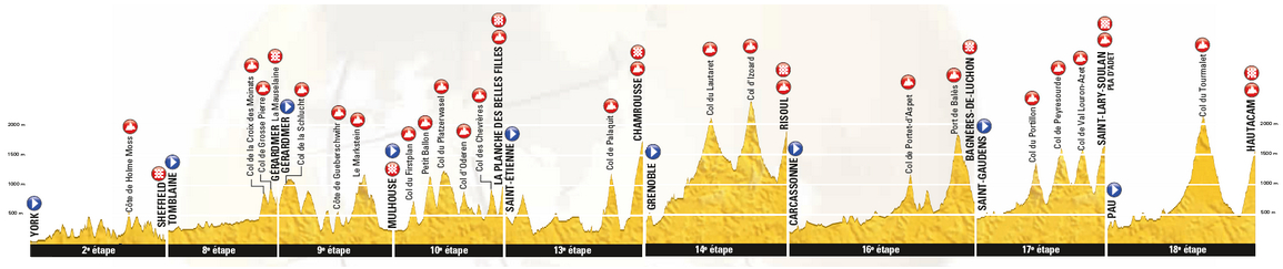 Un recorrido atractivo y novedoso, con una gran cantidad de etapas que pueden resultar movidas y las jornadas a priori claves para la general muy repartidas a lo largo de toda la prueba, con una 1ª mitad donde predomina la media montaña, con etapas estilo clásica y un llamativo tríptico en los Vosgos, y una 2ª mitad donde manda la alta montaña, con 2 etapas en los Alpes y 3 en los Pirineos, y con el colofón final de la contrarreloj, siendo una carrera bastante impredecible. Sin embargo, no todo es tan positivo. Y es que para compensar la exigencia de los primeros días y el duro tránsito por los Vosgos los organizadores han reducido la dureza de la alta montaña, con unos Alpes y Pirineos en conjunto más flojos de lo habitual, tanto en kilometrajes, con sólo 2 etapas superando los 180 km, como en grandes puertos, con únicamente el Tourmalet en la lista de puertos más duros en carrera (aunque Chamrousse se queda cerca, rozando los 300 APM). De hecho, el coeficiente acumulado de los 15 puertos principales ronda los 3270 APM, una cifra considerable pero entre las más bajas de los últimos 10 años, junto a las ediciones de 2008 y 2009.