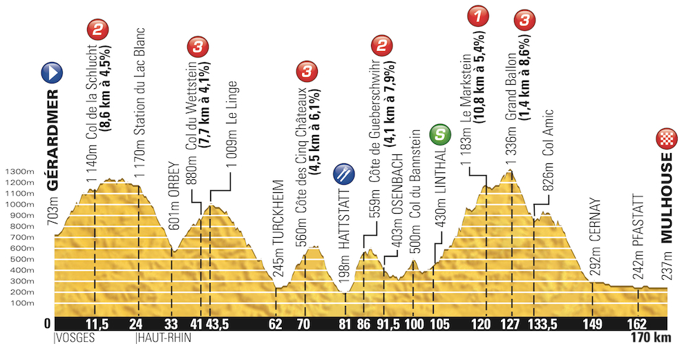 La 10ª etapa, en vísperas del día de descanso, es globalmente la más dura de esta edición, con un trazado a mitad camino de la media y la alta montaña al incluir el Col du Firstplan, el inédito Petit Ballon, con 9,3 km a más del 8%, el Col du Platzerwasel (desde el km 7,2 del perfil), con varios km al 9-10%, los más modestos Col d´Oderen y Col des Croix antes del encadenado final de Chevrères (según otras fuentes el km más duro tiene «solo» un 11,5%: perfil cyclingcols / salite) y la subida a Planche des Belles Filles -> perfil detallado y fotos, con 6 km al 8,5% de media y una última rampa al 20%. Esta ascensión se estrenó en una etapa de 2012 con triunfo para Froome -> clasificación / vídeo, haciendo mucho daño debido al fuerte ritmo marcado por Sky, por lo que en esta ocasión, siendo una jornada más dura, es de esperar que haya grandes diferencias a poco que la combatividad sea similar, sobre todo si el grupo de favoritos llega ya roto al inicio de la subida.