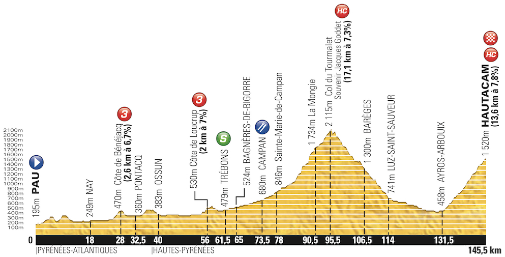 La última etapa pirenaica cuenta con una primera mitad parte o menos llana, aunque incluyendo varias cotas de 3ª, como Benejacq y Loucrup, pero teniendo que superar en su 2ª mitad el mítico Col du Tourmalet -> historia, con 13 km finales al 8,5% de media y destacando por su regularidad, sin rampas extremas pero ningún descansillo; y tras su larga bajada y 18 km de falso llano descendente la subida a Hautacam (desde el km 0,8 al 14,6) -> perfil oficial, más irregular pero con tramos muy duros, para un total de casi 14 km al 7,7%. Se trata de la 5ª ocasión en que Hautacam alberga un final de etapa, con el último antecedente en 2008, con un recorrido casi idéntico y victoria para Juanjo Cobo (tras la descalificación de Piepoli) -> clasificación / vídeo. Fue una etapa entretenida, con buen ritmo en el Tourmalet, donde se descolgaron varios corredores importantes, y una emocionante persecución hasta Argeles Gazost, pero con una actitud demasiado especuladora de los favoritos en Hautacam. Esperemos que en esta ocasión, siendo la última oportunidad para los escaladores, no haya tantos parones y se suba «a cuchillo».