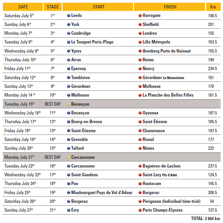 El próximo sábado 5 de julio dará comienzo la 101ª edición del Tour de Francia, la carrera por etapas más prestigiosa y que este año se presenta muy emocionante, con el duelo entre Froome y Contador y otros corredores de mucho nivel, como Nibali y Valverde, al acecho. A nivel de recorrido, destaca la salida desde Reino Unido, algo que no sucedía desde 2007; el regreso del pavé, con 15 km en la 5ª jornada; una montaña más repartida de lo habitual, con etapa estilo clásica el 2º día y jornadas en los Vosgos, Alpes y Pirineos; y sola una contrarreloj, aunque de 54 km. Asimismo, la carrera rendirá homenaje a los afectados por la 1ª Guerra Mundial, cuyo centenario se cumple este año.