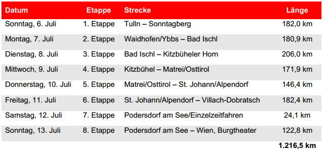 Superado el ecuador de la prueba llegará un duro tríptico que se presenta decisivo: jornada con Iselsberg y el impresionante Hochtor Pass / Grossglockner, subido por la vertiente sur (no tan famosa como la norte pero aún así de enorme dureza, superando los 400 de coeficiente APM) a mitad de la ruta, con la meta en Alpendorf tras una pequeña cota de 3 km al 5%; la etapa reina (6ª), que incluye los puertos de Tauernpass, con 5,5 km centrales al 9%, y Turracher Hohe antes de la larga subida final a Villach-Dobratsh, irregular pero con tramos muy exigentes para un total de 16,7 km al 7,1% de media, pudiendo marcarse buenas diferencias; y la contrarreloj de 24 km en torno a Podersdorf, con un perfil completamente llano. Después de la crono ya sólo restará la clásica llegada en Viena, con un circuito final de casi 17 km y 4 pasos por meta.