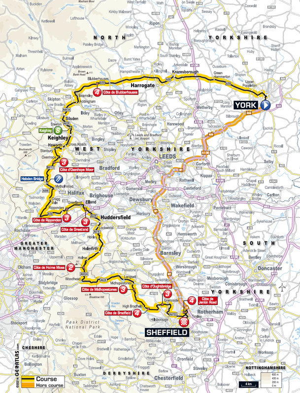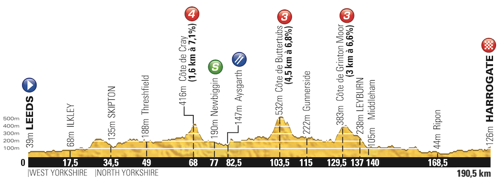 El Tour de Francia 2014 comienza con una etapa en línea en el Condado de Yorkshire, al norte de Inglaterra, con un trazado de casi 200 km entre las localidades de Leeds y Harrogate, incluyendo varios pequeños puertos, entre los que sobresale la irregular cota de Buttertubs, con medio km central por encima del 10% y un total de 4,5 km a a casi el 7%, están lejos de meta, con los últimos 50 km básicamente llanos. No obstante, la llegada tiene tendencia ascendente, con varios repechos suaves y los 500 m finales al 4%, siendo en cualquier caso favorable para los velocistas potentes.