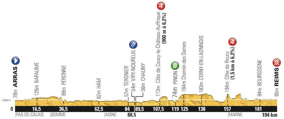 Después de la etapa del pavé toca el turno a una jornada a priori más sencilla con final en Reims, en el departamente de Marne, sin apenas dificultades orográficas más allá de algunas pequeñas cotas, dos de ellas marcadas de 4ª categoría … pero con la amenaza del viento y la posible formación de abanicos si éste sopla de costado y hay equipos con ganas de «marcha», siendo en cualquier caso un día muy favorable para que los sprinters vuelvan a disputarse el triunfo.
