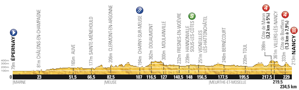 Una de las etapas más largas de esta edición, con 235 km entre las localidades de Epernay, perteneciente a Marne, y Nancy, en el departamente de Meurthe y Mosela, con un recorrido en general llano pero incluyendo varias cotas en el tramo final, la última de ellas, Boufflers, ya dentro de la zona urbana de Nancy, con una subida en línea recta de 1,6 km al 7% (oficialmente es algo más corta y con mayor pendiente, al no contar el primer tramo), coronándose a sólo 5,5 km de la línea de meta.