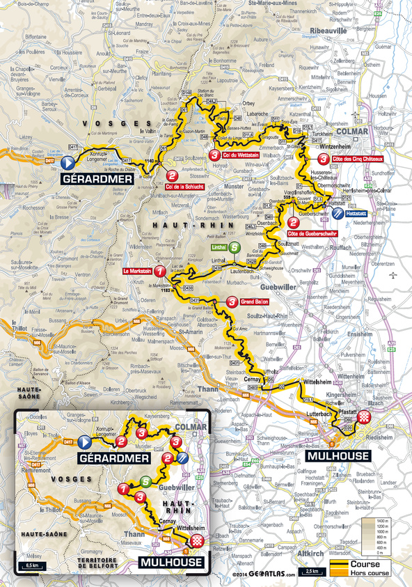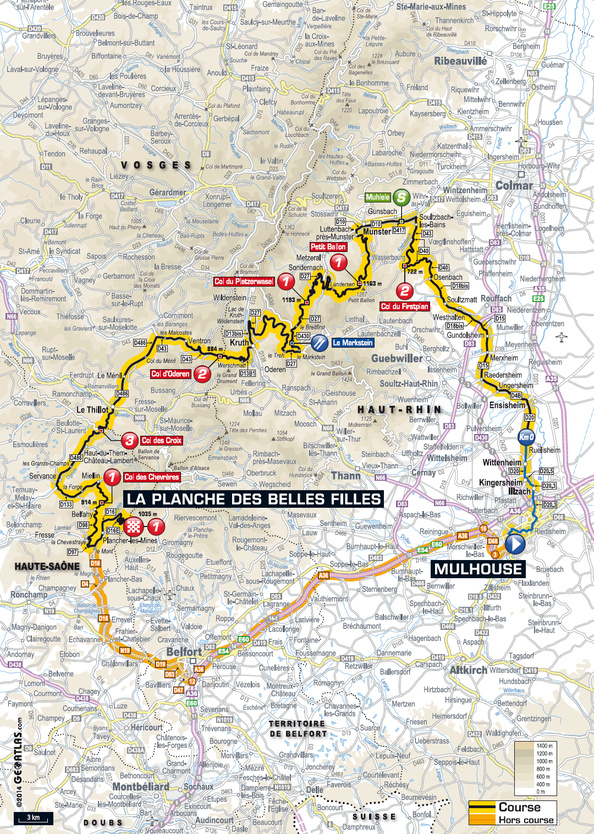 Nueva jornada de media montaña aunque con características opuestas a la de Gerardmer, incluyendo puertos ya desde la salida, con los tendidos Col de la Schlucht y Wettstein-Collet du Linge antes de Wilsbach por Cinq Chateaux, con 4,5 km iniciales al 6%, y el impronunciable Gueberschwihr, con algo más de 4 km al 8% de media y un traicionero repecho después de coronar, que dará paso a la suave cota de Bannstein y al puerto estrella de la jornada, el Grand Ballon por Le Markstein, muy irregular pero con zonas duras, estando la cima situada a 43 km de la línea de meta.