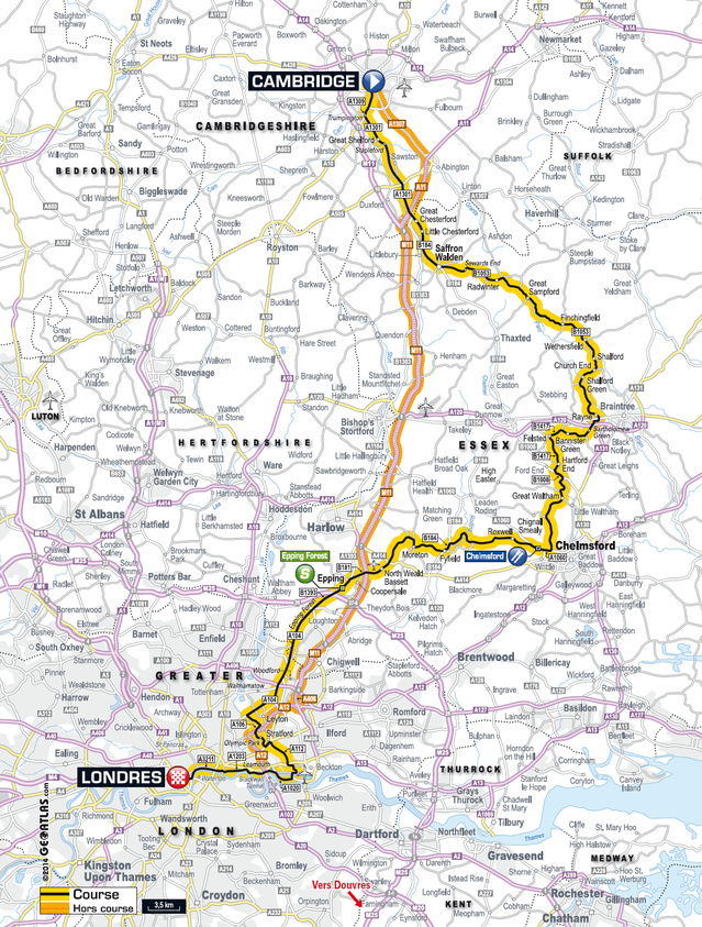 La 3ª etapa es en principio la más sencilla de las que se disputan en Inglaterra, con un trazado muy llano entre Cambridge y la ciudad de Londres, siendo lo más destacado la travesía urbana durante los últimos 35 km, con la llegada situada en la famosa avenida «The Mall», que une el Palacio de Buckingham y Trafalgar Square. Un día totalmente favorable para los sprinters, aunque de nuevo con muchas probabilidades de caídas, sobre todo en caso de lluvia, algo muy habitual Londres.