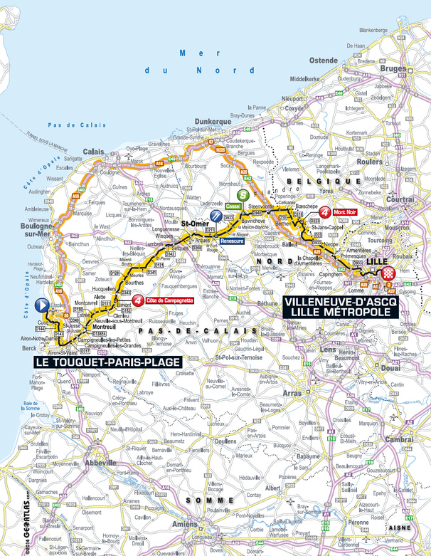 Ya en el continente, después de un traslado en avión hasta el norte de Francia, etapa bastante llana entre la localidad costera de Touquet Paris Plage, en el departamento de Pas de Calais, y la Villeneuve d´Ascq, en la zona metropolitana de Lille, siendo de nuevo una jornada propicia para que los velocistas impongan su ley. En cuanto a los favoritos, jornada de transición en vísperas del pavé, aunque deben de estar atentos para no verse involucrados en caídas y cortes en los últimos km.
