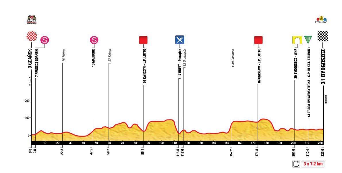 ETAPA 1ª (Domingo 3 agosto): GDANSK – BYDGOSZCZ (226 km). Rutómetro / Últimos km / Mapa salida – llegada