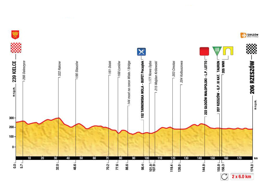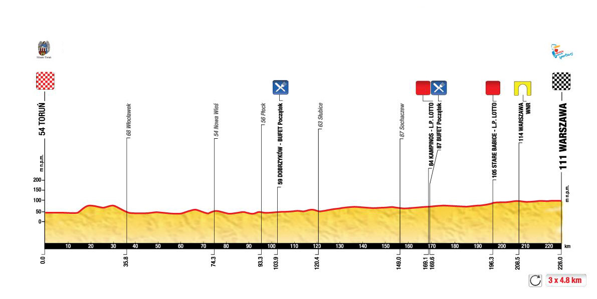Asi pues, la carrera se inicia al norte de Polonia, con 2 etapas largas y sin dificultades montañosas con llegadas en Bydgoszcz y la capital Varsovia respectivamente, en ambos casos incluyendo pequeños circuitos finales y con varios pasos por meta. Después de un largo traslado hacia Kielce, ya en la zona sur del país, la prueba continúa con otras 2 etapas llanas, la 2ª de ellas, con final en Katowice, siendo la más larga de toda la prueba al acercarse a los 240 km.