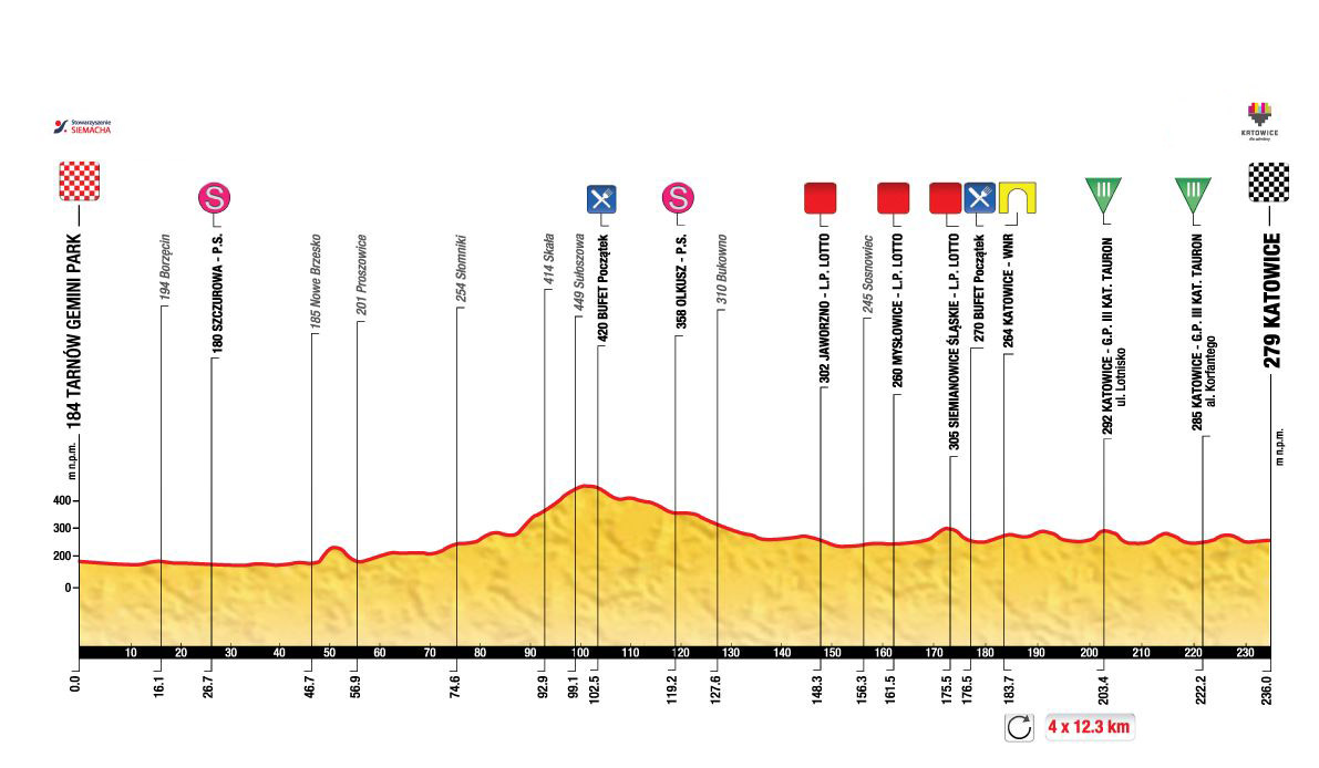 ETAPA 4ª (Jueves 6 agosto): TARNOW GEMINI PARKE – KATOWICE (236 km). Rutómetro / Últimos km / Mapa salida – llegada