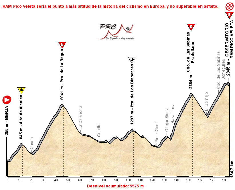 La etapa sale de Berja, cerca de la costa de Almería, y los primeros 45 km son un suplicio. Nada más tomar la salida se comienza a ascender el Alto de Alcolea y sus 10 km al 5%, pero que son poco más que un aperitivo de lo que llega justo después. En Cherín se encaran las rampas de uno de los grandes puertos de España, el Puerto de La Ragua. Supera nada menos que 1510 metros de desnivel en sus 25,2 km, con una media del 6% bastante regular en la subida, pero con varias rampas del 13% en las zonas más duras. Tras bajar a La Calahorra aparece el terreno sencillo, roto en la parte central de la etapa por los repechos del Puerto de Los Blancares (9,4 km al 3,4%) que dan acceso a los alrededores de Granada.