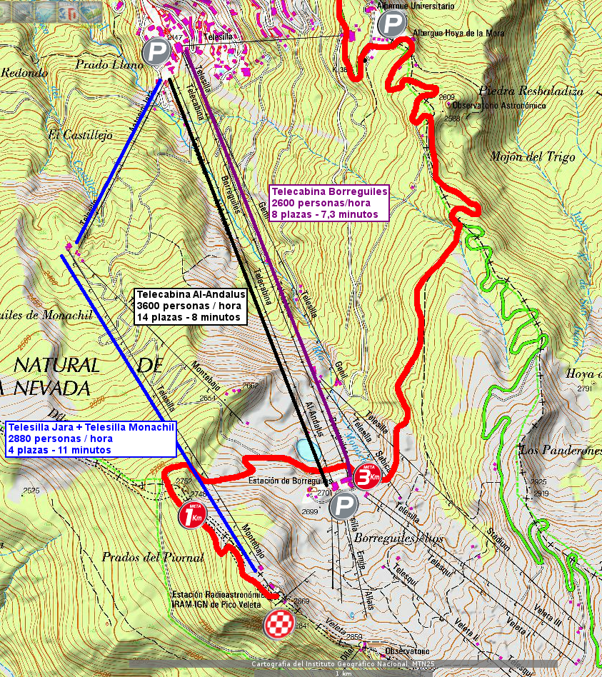 Estamos en la estación de esquí Sol y Nieve de Sierra Nevada, y el IRAM y Borreguiles son un punto clave para ella. Hay dos telecabinas desde Pradollano hasta Borreguiles, y un telesilla lleva hasta el IRAM. Junto a los edificaciones de la cima hay sitio suficiente para colocar la meta, y en Borreguiles, a unos 3 km del final, hay espacio de sobra para todo lo demás. A esto hay que sumar los amplios aparcamientos en Hoya de la Mora (punto más alto que a alcanzado La Vuelta en Sierra Nevada, acabando ahí algunas de sus etapas) y por supuesto en Pradollano, desde donde salen los telecabinas y telesillas hacia arriba. En este esquema se entiende mejor la logística, que creemos similar a la que se daba por ejemplo en Cuito Negru.