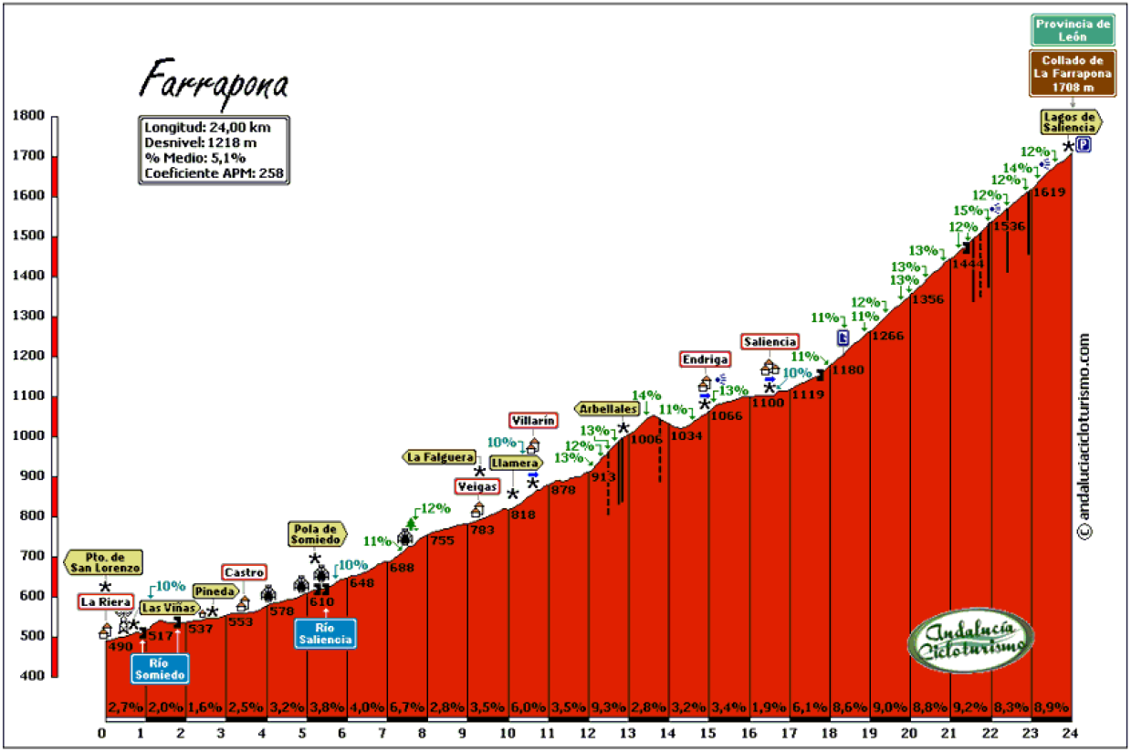 - La Farrapona, 1ª (Meta): 1.705 m – 16,5 km – 6,2 % (sin contar subida previa)