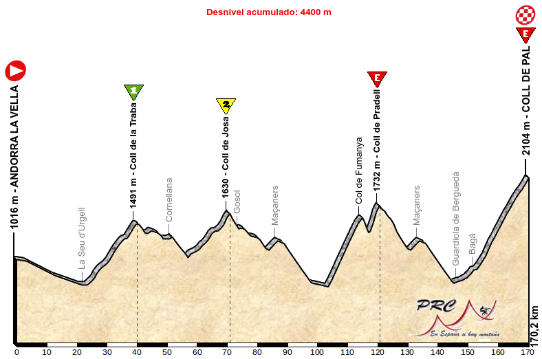Se alcanza así Guardiola de Berguedá y el final coincide con los anteriores, por Bagá hasta el Coll de Pal, completando una etapa de 6 puertos de dureza variable pero todos perfectamente enlazados. Y si bien en principio parece una etapa donde los grandes favoritos esperarían al puerto final, el duro terreno es propicio para variables tácticas, fugas peligrosas y sobre todo un grupo tan reducido como las fuerzas de los corredores en la base del final en alto. Además, tanto Toses como Creueta y Sobirana, sin ser grandes colosos, tienen zonas duras para que salte la sorpresa.