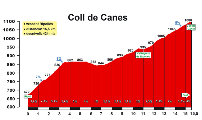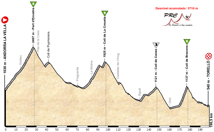 De nuevo aparece otra larga bajada y terreno favorable hasta llegar a Ripoll, donde aparece el Coll de Canes. Buena carretera y pocas rampas hacen de este un paso sencillo, pero da continuidad a un terreno de subidas enlazadas por terreno rápido que puede dificultar el control de las escapadas, seguramente numerosas y de buenos escaladores al haberse formado en Envalira. La fácil bajada hasta Olot completa los primeros 160 km de la etapa. Unos 10 km de falso llano ascendente dan paso al protagonista del día, el Coll de Bracons y sus duras rampas, desde cuya cima se llegará rápidamente hasta la meta en Torelló gracias a una bajada rápida y revirada primero, que da paso luego a un falso llano favorable con algún pequeño repecho, incluyendo el de la meta, unos 750 m al 3-4%.