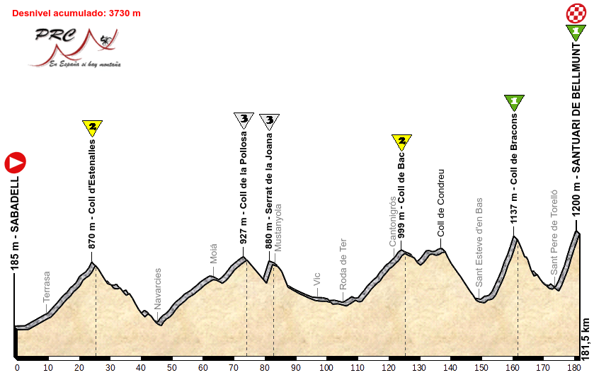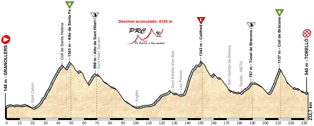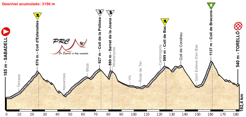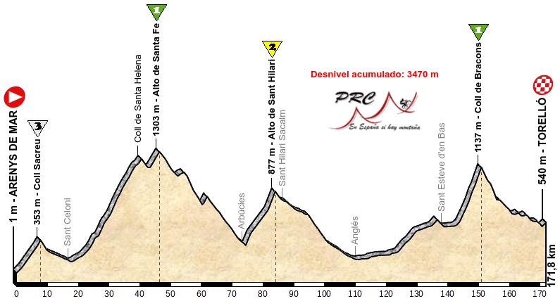 Tercera etapa que, como la anterior, usa las carreteras del Macizo del Montseny para endurecer la carrera, pero en esta ocasión en una jornada más corta donde se busca directamente el final con Bracons. Partiendo junto al mar en Arenys se pone rumbo al cielo primero con el modesto Coll Sacreu, y luego con la eterna ascensión hasta Santa Fe del Montseny por Santa Helena, mismo puerto que en la segunda etapa. Pero en esta ocasión se desciende por completo hasta Arbucies para subir así a Sant Hilari Sacalm por su cara más larga y dura, completando 85 km iniciales de continuo sube y baja.