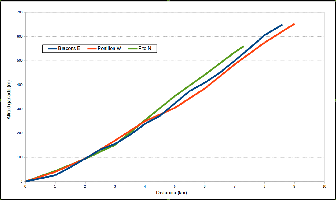 Para mostrar que tipo de puerto y dureza esconde Bracons qué mejor que la siguiente comparativa con dos puertos muy conocidos, la vertiente francesa del Col de Portillón por un lado, casi un calco, y el Mirador del Fito por otro, algo más corto pero de similares rampas. Sirva esta gráfica para visualizar que estamos ante un puerto suficientemente rompedor como para deparar batalla entre los favoritos si se sitúa su cima cerca de meta, y con más motivo si llega en una etapa con dureza acumulada.