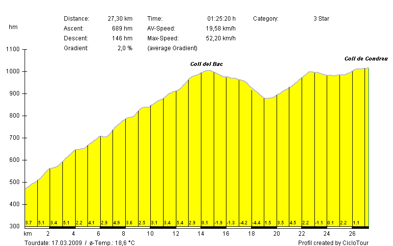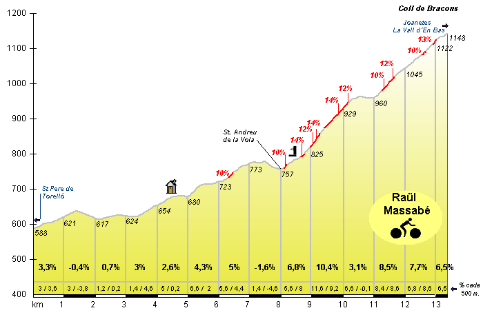 Tras superar la llanura de Vic, se encara el puerto que mejor enlaza con Bracons, el Coll de Condreu por Cantonigros. La pancarta del puerto la hemos colocado en el Coll de Bac tras 14 km al 3,7%, de nuevo puerto largo y tendido. Tras ella se crestea hasta el Coll de Condreu donde comienza la bajada que rápidamente nos deja a los pies de Bracons. Si hasta ahora todo eran puertos largos y tendidos, con Bracons (7,6 km al 8,2%) y Bellmunt (6,5 km al 9,1%) todo cambia, puertos cortos pero siempre duros para un final de infarto que, como comentamos más arriba, presenta por desgracia problemas de espacio en la cima para albergar la meta.