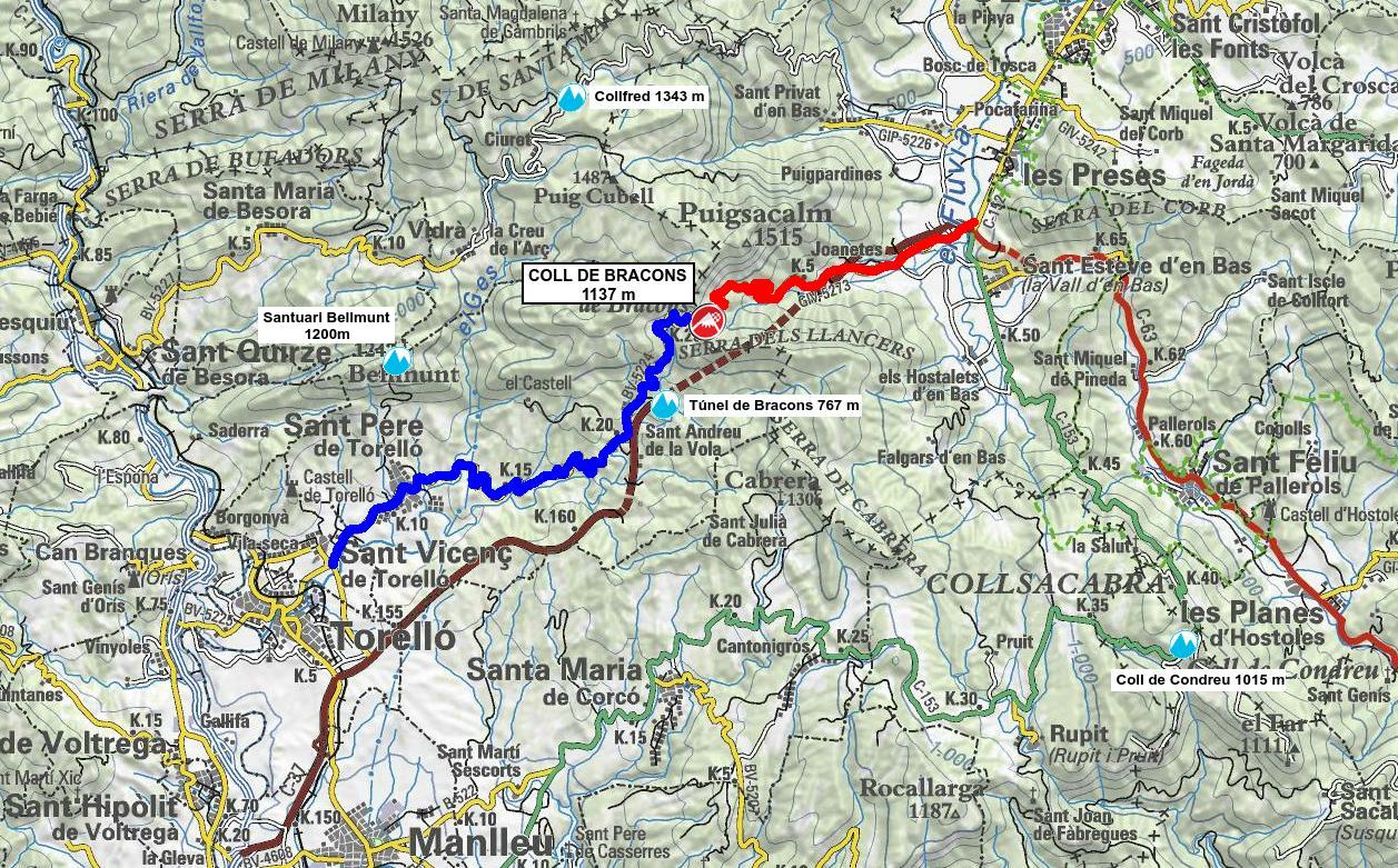 Veo que todas las etapas por la ‘vertiente dura’ de Bracons (la de Joanetes, 8 km al 8%) la hacéis terminar en Torelló después de 21 kms pero se podria finalizar perfectamente en la Vall d’en Bas o Olot (que tienen más pasta y están mas interesadas en el ciclismo, veáse Terra de Remences o finales en Volta a Catalunya). Os explicaré el truquillo. Después de subir Bracons por su vertiente dura se inicia la bajada y en 5 quilometros -justo antes de Sant Andreu de la Vola (km 20,5 de la BV-5224)- hay un acceso perfectamente asfaltado a la C-37 que da a la entrada del Túnel de Bracons. Desde este punto hay 10 kms hasta la Vall d’en Bas (9 de ellos en muy rapida bajada), 12 hasta les Preses o 15 hasta el centro de Olot. Por no hablar de hacer un bucle de dos o tres subidas a Bracons…. Je Je.