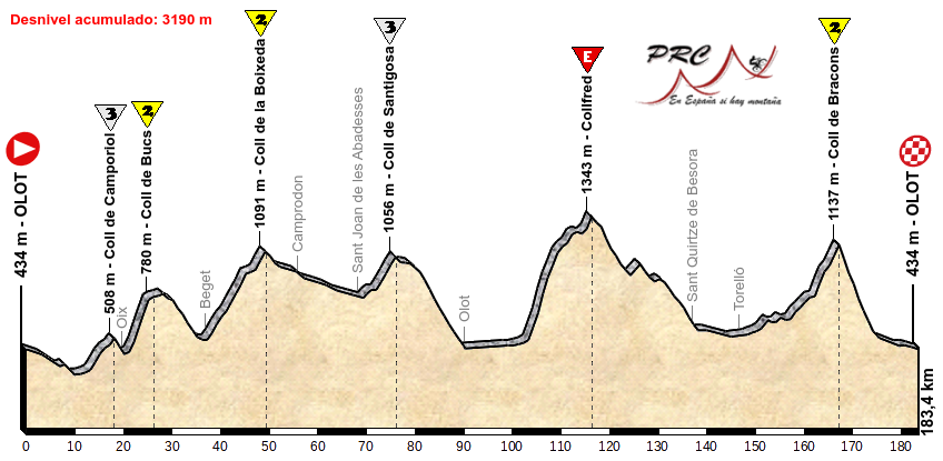 Como propuesta final presentamos de nuevo dos variantes, los puertos de inicio y la elección del final, realizando un lazo alrededor de Olot que alberga la salida, la meta, y un paso a mitad de etapa. Tras la salida y un corto tramo favorable, se entra en la preciosa carretera de Oix y Beget, que enlaza tres puertos: Camporiol (5,2 km al 4,4%), Bucs (4 km al 8,8%) y la Boixeda (12,5 km al 4,9%) antes de salir a Camprodon y volver hacia el sur por el Coll de Santigosa (6,6 km al 4,2%) llegando de nuevo a Olot.