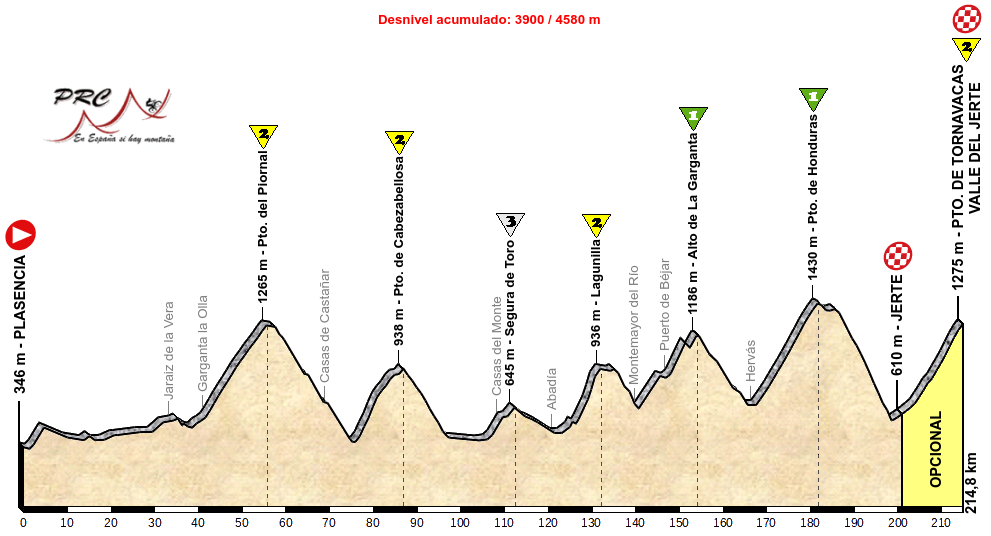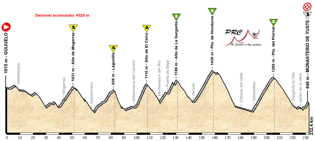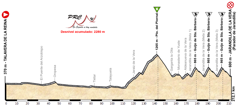 Es poco después de atravesar el Río Tietar cuando empieza la larga y tendida ascensión al Puerto del Piornal por la carretera que desde Jaraíz de la Vera lleva al pueblo de Piornal por el SW, unos 30 km al 3,5%, más de 1000 metros de desnivel salvado que servirán de aperitivo antes del circuito final. La bajada por Garganta la Olla da paso a una zona de repechos por el Monasterio de Yuste y Aldeanueva de la Vera antes del primero de los 4 pasos por la meta del Castillo de Jarandilla.