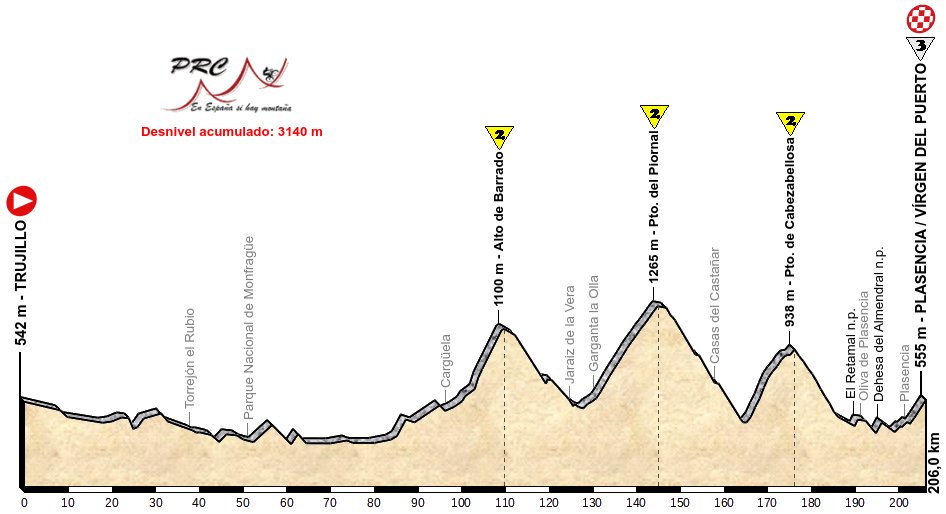Con salida en la monumental villa de Trujillo, la carrera pone rumbo norte atravesando las dehesas extremeñas, pero destaca fundamentalmente el tránsito por el Parque Nacional de Monfragüe. Se llega así a La Vera para subir al Alto de Barrado por Carguera (9,6 km al 6,2%), subida irregular con alguna zona dura y primer contacto con la montaña del día. Sin solución de continuidad, se encadenan otros dos puertos de segunda. Primero, el largo y tendido Puerto del Piornal por Garganta la Olla (14,2 km al 4,9%). Se remata esta secuencia subiendo al Puerto de Cabezabellosa, que si bien en total cuenta con 11 km al 5% de media, concentra su dureza en 4 km al 7,4% antes del pueblo de El Torno. Se corona a unos 30 km de la meta.
