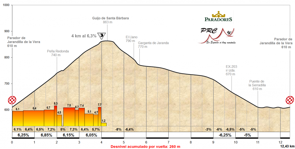 Hola, es de agredecer vuestra iniciativa sobre esta extraordinaria zona de extremadura, en el norte de caceres se pueden hacer etapas preciosas de montaña. Con respecto a los finales en plasencia, es muy bonita la ascensión a la ermita de la virgen del puerto, pero existe una subida más dura y explosiva en la ciudad. Se trata de la ascensión al repetidor de Santa Bárbara, 4,5 km aproximadamente con unos 300 mts de desnivel, una pendiente media de alrededor de 7% y con rampas de mas del 15 %, a lo largo de una carretera estreechita, que parecen auténticos muros.