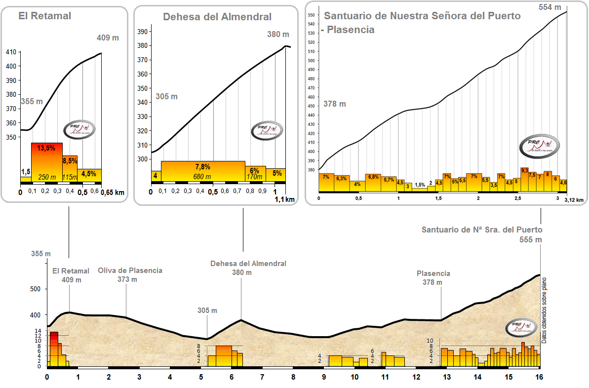 La carrera llega así a las faldas del Monte Valcorchero, y aparecen las primeras rampas, suaves y aisladas, hasta alcanzar las calles de Plasencia. Una vez allí comienza de verdad la ascensión final al Santuario de la Virgen del Puerto, 3,1 km al 5,7% con las rampas más duras del 8-9% en su medio kilómetro final. Se remata así una etapa de media montaña con puertos largos y zonas duras lejos de meta a los que da continuidad un bonito terreno quebrado, abriendo el abanico de posibilidades de la etapa.