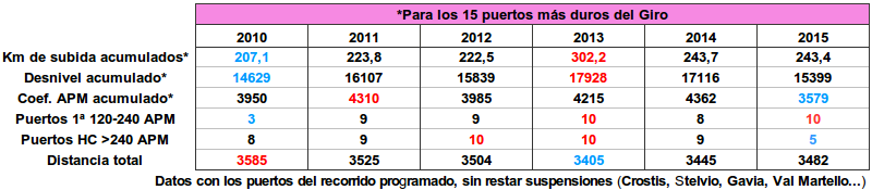 Comparando el Giro 2015 con sus inmediatos predecesores, el descenso de dureza en su top-15 de puertos es notable, pasando de rondar e incluso superar ampliamente los 4000 APM a quedarse en menos de 3600. En términos de desnivel acumulado, sin embargo, la bajada no es tan acusada, lo que indica que han apostado por puerto largos pero en general sin tramos tan extremos como en año anteriores. El otro gran cambio viene en el número de puertos HC, algo ya comentado anteriormente. Y es que se pasa de 8 ó 10 a solamente 5. En la distancia total de la prueba apenas hay variación. Sin embargo, debemos apuntar que la bajada de dureza es menor, e incluso inexistente, si se tiene en cuenta la media montaña, muy abundante, dura y variada en 2015, mientras que por ejemplo estaba poco menos que ausente en 2014. Además hay que tener en cuenta la CRI de Valdobbiadene, la de mayor distancia de los últimos años y que con una hora larga de esfuerzo individual será una etapa muy exigente.