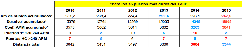 El Tour 2015 incrementa la dureza de sus puertos respecto a 2014, eso es indudable, y de hecho tiene la alta montaña más dura de las últimas ediciones, aunque por muy poco, eso sí: cuenta con más kilómetros de subida, más desnivel acumulado y mayor coeficiente APM, pero si lo comparamos con 2011 se trata de una mejora bastante pequeña. Eso sí, al menos en este aspecto la carrera va en la buena dirección, pues hace ya tiempo que se necesita un aumento en la exigencia de la montaña francesa, que idealmente debería venir de la mano de nuevos puertos rompedores. Pero hemos de repetir que la dureza de la montaña de este Tour no significa que sea buena montaña, pues su colocación en carrera unida a la vergonzosa distancia contrarreloj la penalizan mucho, siendo además la edición con menor kilometraje total.