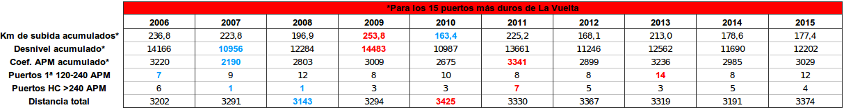 Por octavo año consecutivo (2008, 2009, 2010, 2011, 2012, 2013 y 2014), publicamos la comparativa entre los puertos de montaña de cada Gran Vuelta para su futura edición, utilizando para ello los datos de los 15 puertos de montaña más duros de cada carrera y del número de puertos de 1ª (coeficiente APM entre 120 y 240) y Especial (coeficiente APM superior a 240) que subirán los corredores.