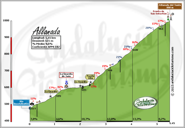 La Allanada del Santo por Guardia de Jaén (*se subirá desde el km 0,8, al llegar por otra carretera). Perfil de Andalucía Cicloturismo, click para ver descripción y fotos
