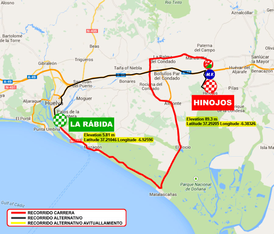 1ª ETAPA, Sector 1 (Martes 18):  LA RÁBIDA – HINOJOS  (118 km).  Rutómetro / Mapa interactivo  / Plano salidallegada / Últimos 3 km