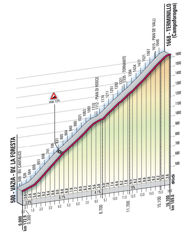 Aunque novedoso en esta carrera, el Terminillo es una subida mítica del Giro de Italia, siendo el final en alto más repetido en la historia de la prueba, con 9 llegadas (aunque las 4 primeras, en la década de los 30, en forma de cronoescalada), además de haberse utilizado como puerto de paso, hasta Sella di Leonessa, en varias ocasiones, la última en la edición de 2007.