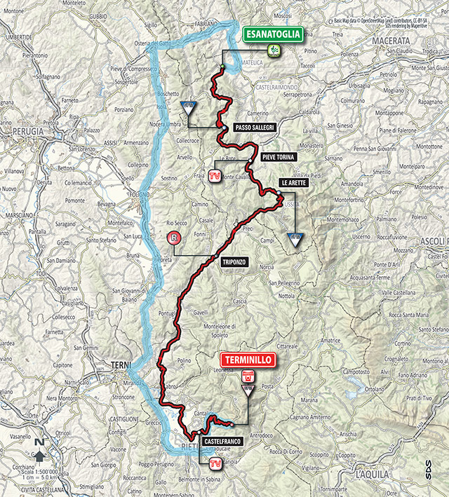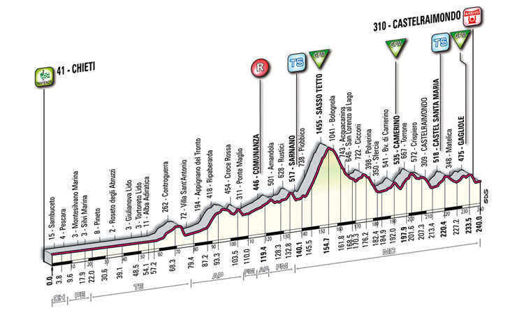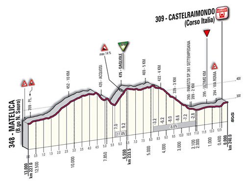 A priori, la etapa reina, con casi 200 km entre la localidad de Esanatoglia, perteneciente a Macerata, y la estación de esquí de Campoforogna, en el Monte Terminillo (Sella di Leonessa), incluyendo de inicio la cota de La Morca y los puertos de Montelago (Sallegri), con una zona de 5 km al 7%, y Le Arette, irregular pero con un tramo central duro, siendo un buen terreno para que se forme una escapada de nivel, y ya en el último tercio el tendido Forca di Arrone antes de Castelfranco y la subida final al Terminillo, con unas cifras totales de 16,1 km al 7,3% de media.