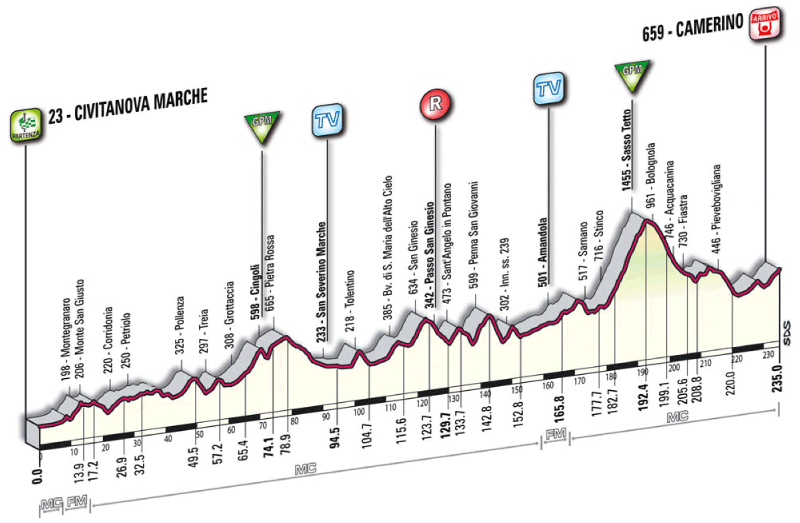 Volviendo a la etapa de este año y como decíamos en el análisis general, el recorrido definitivo es distinto al que se anunció en diciembre, con un trazado que incluía el inédito Monte San Vicino, con 14 km de subida (los 4,5 km centrales al 9%), y el propio Gagliole antes de la cota de Crispiero, dando como resultado 80 km finales a priori espectaculares. Pero sin haber aclarado los motivos, los organizadores han suprimido San Vicino, añadiendo, eso si, un 2º paso por Crispiero, quedando una etapa dura pero menos que la original, además de tener peor continuidad.