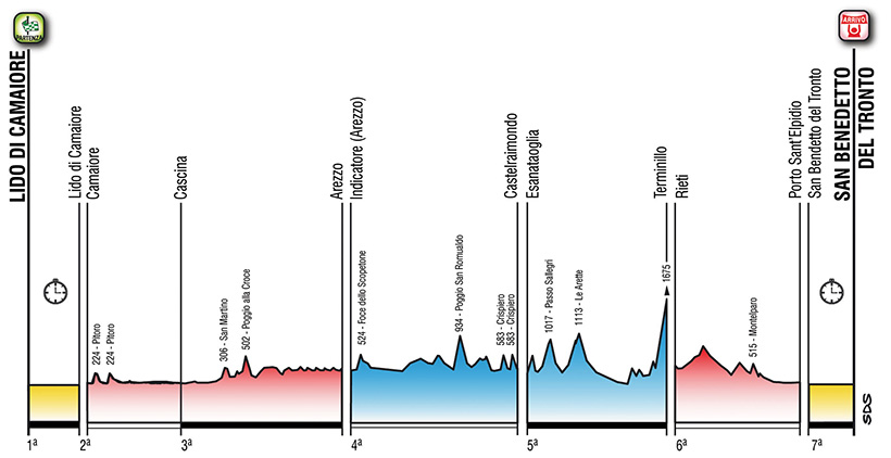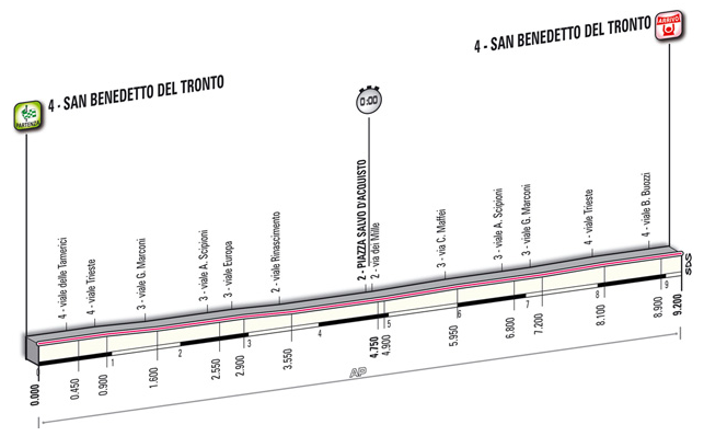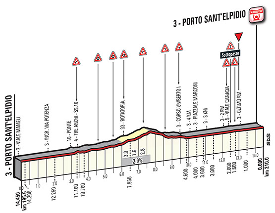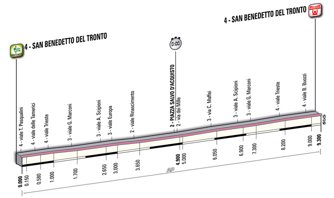Como ya es habitual en las últimos años, la prueba se despide con una contrarreloj individual corta en San Benedetto del Tronto, localidad costera perteneciente a la provincia de Ascoli Piceno, teniendo un recorrido completamente llano y sin apenas curvas.
